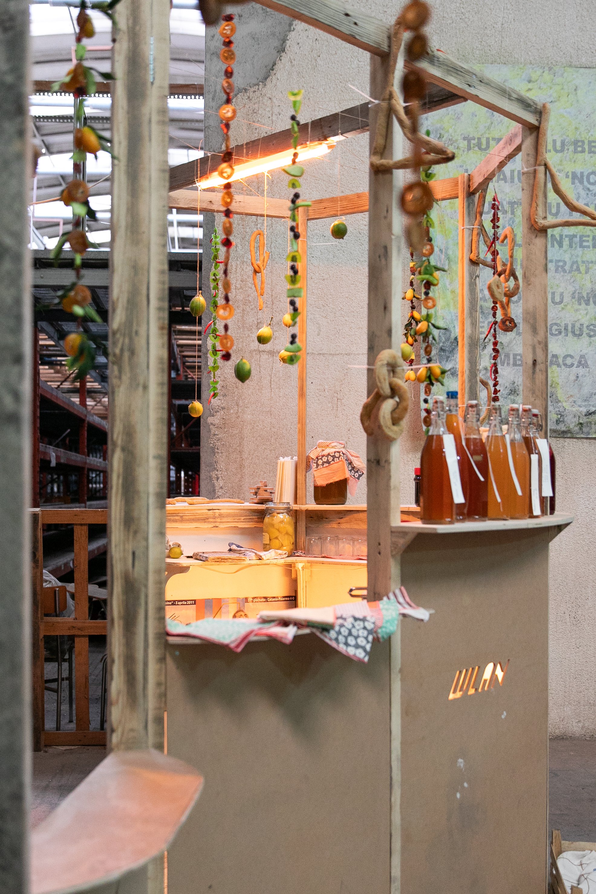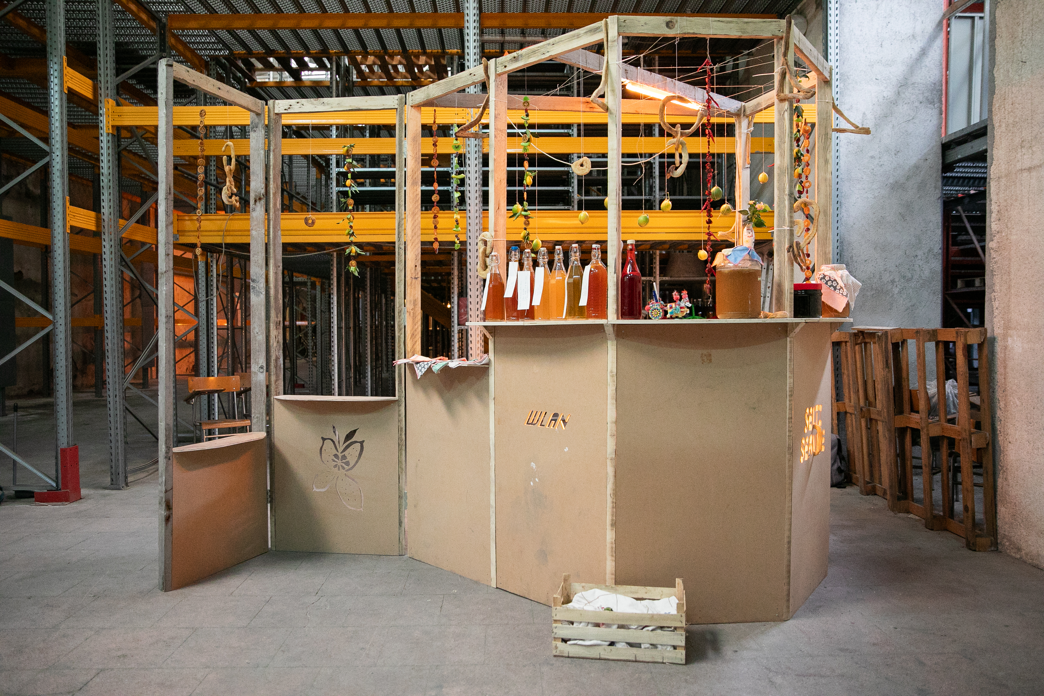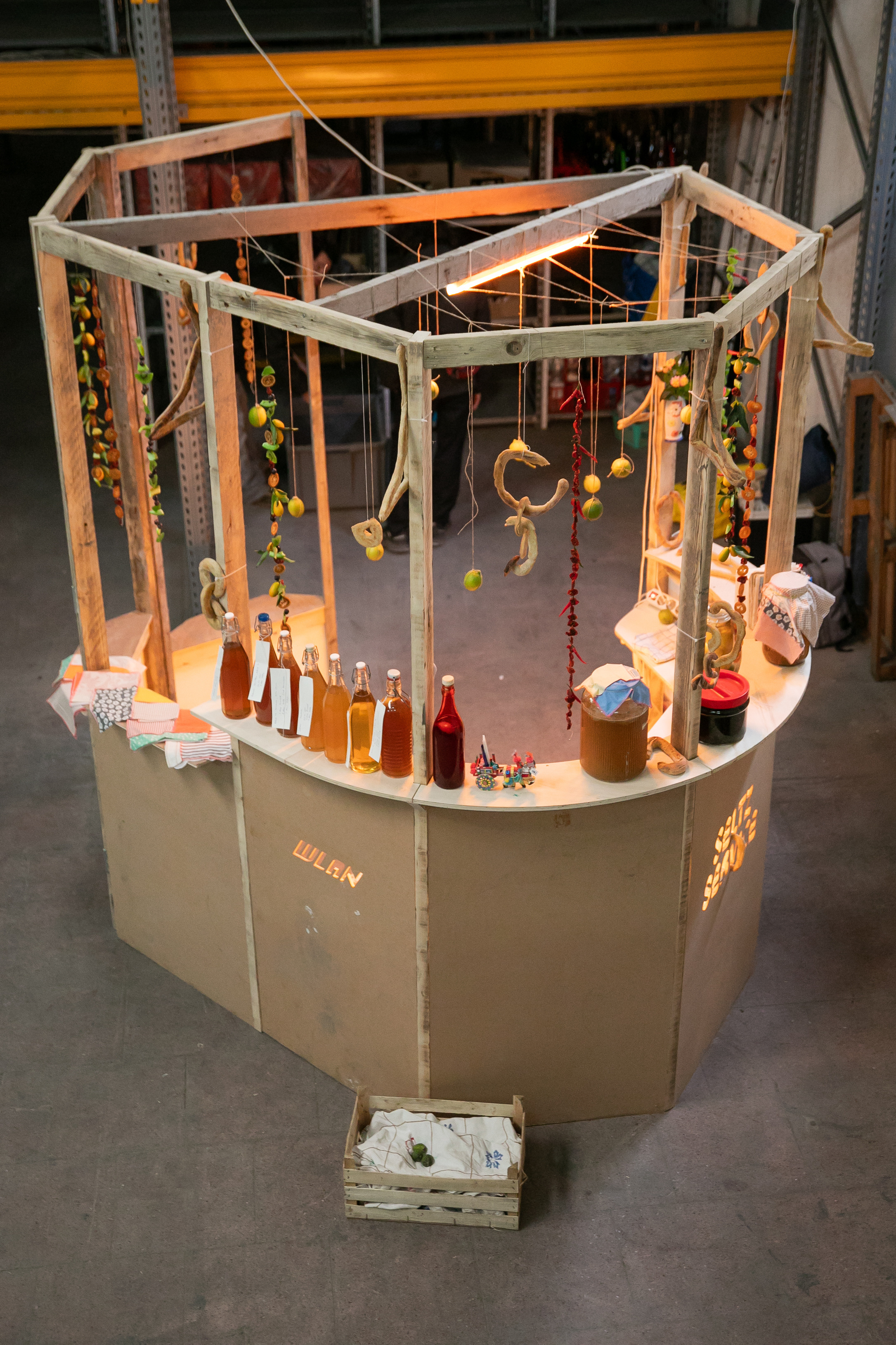 A project with Julia Walk. As part of the festival fudda, a workshop was held on fermentation, soft drinks and recycling materials. Together with the participants, a kiosk was designed and built as a display for the festival. One of the aims was to investigate forms of coexistence and cooperation through the intertwining of culinary, sculptural or performative practices.